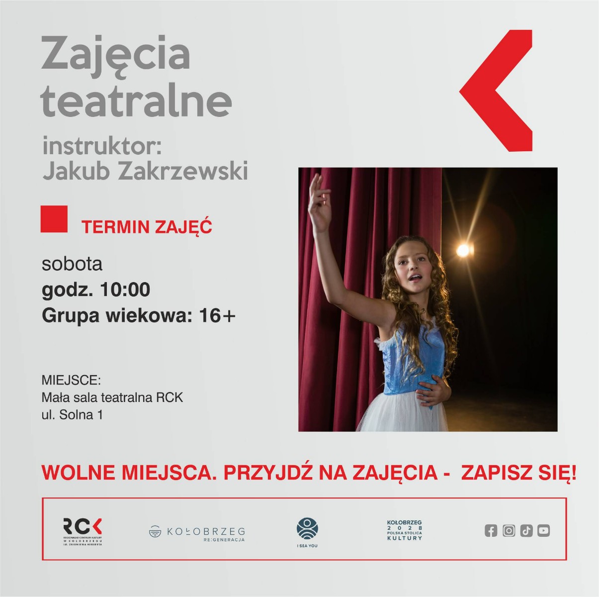 Zapraszamy na bezpłatne zajęcia teatralne z instruktorem Jakubem Zakrzewskim.