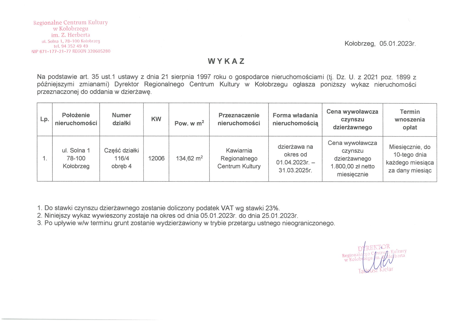 Dyrektor Regionalnego Centrum Kultury w Kołobrzegu im. Z. Herberta ogłasza wykaz nieruchomości przeznaczonej do oddania w dzierżawę - kawiarnia.